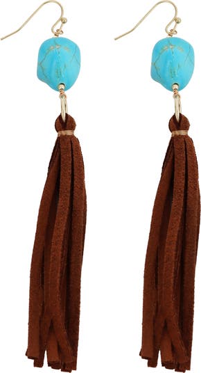 Leather tassels and vibrant turquoise beads make these earrings the perfect way to bring boho-chic style to your look.
