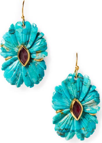 Turquoise gets hand-cut into magnolia blooms and centered with inset garnet to make statement-making drop earrings.