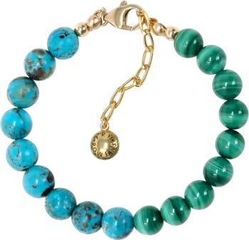 We’re feeling this cool refresh in blue and green. Genuine turquoise round beads paired with a unique light green malachite make for a pretty rad wrist situation.