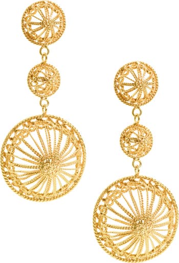 The Amira statement earrings are an elegant celebration of form and craft, a collaboration design with charity Turquoise Mountain. Three filigree domes, each uniquely proportioned, descend in sculptural rhythm to create a dramatic drop earring. Handcrafted by female artisans in Afghanistan, every curve carries the weight of ancestral skill and the lightness of modern refinement. Crafted in 18ct gold-plated silver, Amira is a piece that speaks of strength, artistry and timeless sophistication.