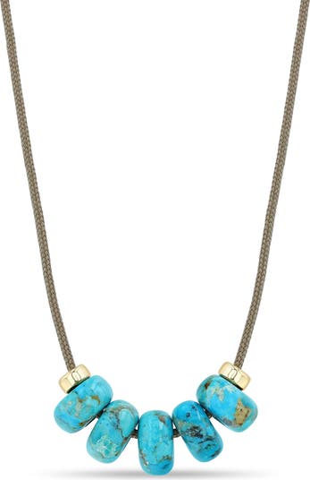 Shiny 14-karat gold rondelles and vibrant turquoise stones bring earthy color and texture to this necklace that adjusts to your liking on a sliding paracord.