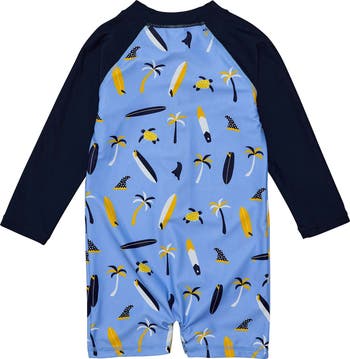 Long sleeves provide baby with extra coverage from the sun in this one-piece swimsuit that's easy to get on/off with a quick front zip closure and convenient snaps.