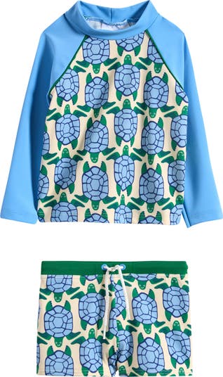 Your little swimmer will be well-protected in a set that features a long-sleeve rashguard and a pair of trunks, all decorated with a herd of happy turtles.