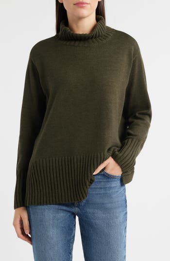 Rich Merino wool threads knit a staple pullover turtleneck top finished with a roomy silhouette and rib-textured hems.