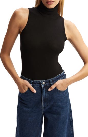 Sleek and sleeveless, this midweight bodysuit is made of a fine-gauge knit and topped by a turtleneck.