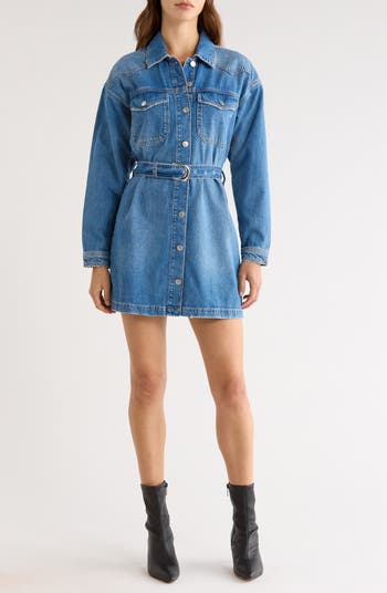 Golden topstitching and a removable belt shape this no-stretch denim dress designed with long sleeves and Western-inspired accents at the shoulders.