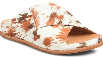 Wide, crisscrossing straps amplify the dimension of a genuine calf-hair slide sandal grounded by a cushioned footbed and treaded rubber sole.