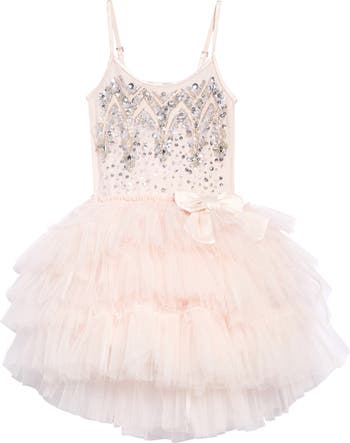 Glistening sequins and beads dazzle the bodice of a center-stage dress with a floaty ballerina skirt in soft layered pink tulle.