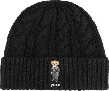 Knit from a warming blend of merino wool, alpaca and linen, this classic cabled beanie sports the dapper embroidered tuxedo bear to accent the foldover cuff.