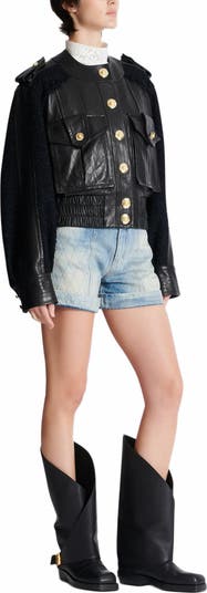 Lambskin leather and tweed bomber jacket with topstitched Diamond pattern