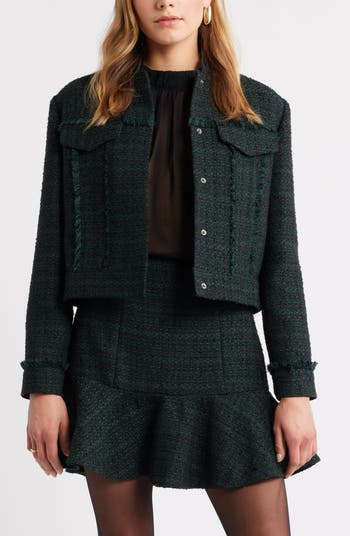 A richly hued tweed in a nubby bouclé textures a fringed jacket fashioned in a slightly cropped profile with a contemporary snap placket.