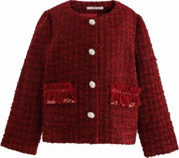 A polished layer with timeless charm, this tweed jacket adds texture and structure to any formal look. Its classic cut and crisp detailing make it a versatile piece for seasonal styling. Textured tweed fabric with contrast white buttons for a refined finish. Patch pockets with tonal trim add subtle dimension and practicality.