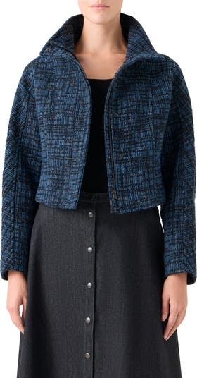 Kimono-inspired curved sleeves and a stand collar bring a sleek architectural look to this cropped jacket cut from cotton-forward tweed in a mélange weave. A signature ring zipper pull adds a sporty flourish.