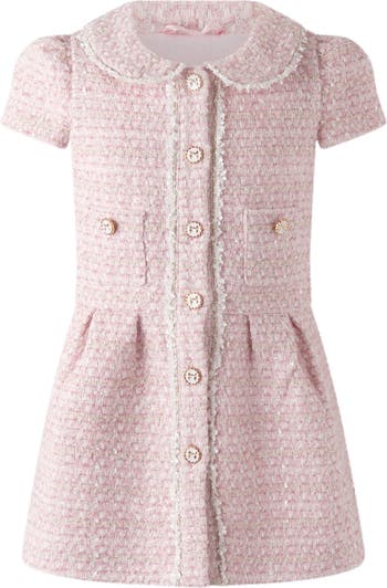 A charming twist on a heritage classic, this Tweed Dress blends timeless tailoring with soft, feminine detail. Crafted in blush-toned tweed, the silhouette features a rounded Peter Pan collar, pearl-style buttons, and delicate fringe trim along the placket and collar—hallmarks of Rachel Riley’s refined craftsmanship. Gentle pleats at the waist add structure while allowing for comfort and movement, making it as wearable as it is elegant.