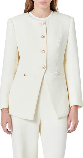 Asymmetric lines and a collarless silhouette define an tweedy jacket accented with brassy buttons. Wear it to complete a workday look or elevate a weekend 'fit.