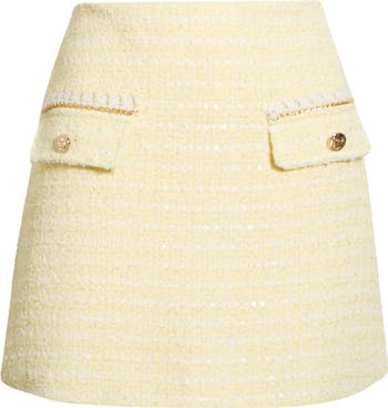 Gilded accents gussy up a tweedy skort offered in a buttery hue.