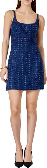 Traditionally prim and proper tweed gets a saucy upgrade in this flirty minidress featuring a playfully scooped neckline and slender tank-style straps.