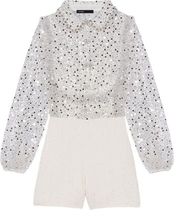 The Lunar New Year capsule inspires a wardrobe that is both bold and refined, where transparency meets rich textures to reveal every facet of your style.This playsuit combines a transparent tulle top with silver and black sequins with bright ecru tweed shorts for an ultra-graphic, textured look. The top is enhanced by an intricate collar with rhinestones and pearls and a fine tulle ruffle surrounding the button placket with its jewellery buttons. An invisible zip fastening on the side and a built-in lining add extra comfort to the piece.For a contrasting, assertive look, wear it with a sweater tied at the waist, an M bag and metallic pumps.