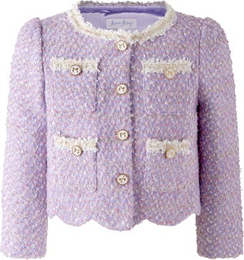 A beautifully coordinated two-piece set with timeless appeal, the Purple Tweed Jacket & Skirt Set blends classic tailoring with a soft, pastel palette. Crafted in textured lavender tweed, the jacket features braided trim, a scalloped hem, and signature gold-tone buttons, while the matching skirt completes the look with effortless elegance. Designed to feel polished yet comfortable, this set is perfect for dressing up without feeling overdone.