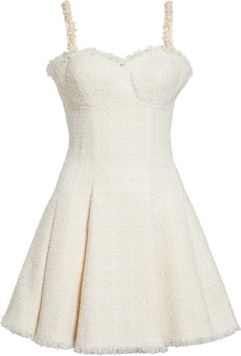 Thin straps embellished with beads and shells begin the beach vibes for this tweed skater dress designed with a swimwear-inspired corset-style bodice.
