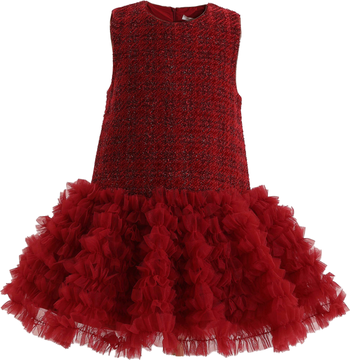 A standout blend of texture and volume, this dress pairs a shimmering tweed bodice with a playful tulle skirt. Perfect for parties and festive occasions, it’s designed to dazzle with every twirl.