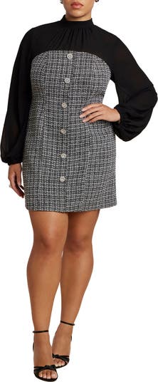 100% Polyester Close fit Mock neck, back zipper Shirring at the front neck Rhinestone buttons at the front non-functional placket sleeve with elastic cuff, long sleeve Mini length 39” from highest point of shoulder on size 18 Non-stretch woven Turn garment inside out, machine wash cold gentle cycle with like colors. Only non-chlorine bleach when needed. Do not tumble dry. Lay flat to dry. Cool iron as needed.