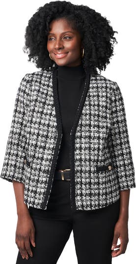 - Classic&mdash there&rsquos no better word to describe this elegant jacket. Made from tweed, fashioned with a sophisticated braided trim, it&rsquos a must-have piece for elevating your wardrobe. Pair it with our black True Fit Jeans for a chic look that you'll love to wear time and time again. V-neckShaped silhouetteSet in ¾ sleevesWelt pockets at waistBraided trimHook and eye closureFully lined30&rdquo lengthPolyesterMachine washableImported