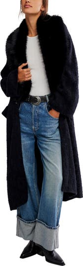 Dial up the drama without sacrifing an ounce of comfort in the lengthy silhouette of this plush cardigan made even more impressive with a flourish of faux fur around the collar.
