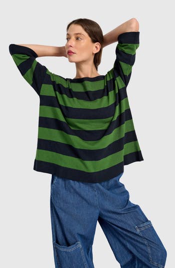 A minimalist staple with subtle flair, this sweater is crafted from a smooth striped cotton blend that drapes with ease. Its boxy cut and hip-length hem offer a modern shape, while bracelet sleeves and a boat neckline lend casual sophistication. Ideal for transitional weather.