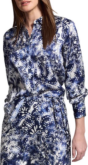 A mix of abstract prints artfully decorates this silk-kissed satin button-up made with a hint of stretch for a comfortable fit.