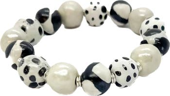 This Kazuri bracelet features beautifully handcrafted ceramic beads made from locally sourced clay, shaped and painted by talented artisans. Each bead is kiln-fired for durability and decorated with intricate, vibrant designs. Striking color contrasts and bold form define the Sefone Bracelet, making it a confident and refined accessory, and a standout piece for both everyday wear and special occasions. Length 2.76 X 2.38 inches Bead size: Round bead 10mm 18k-gold plated Made in Kenya