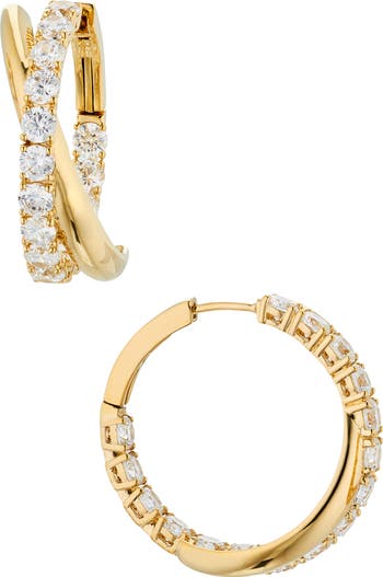 Shimmering cubic zirconia illuminate the curves of these sleek crossover hoops serving timeless elegance with a dash of modern whimsy.