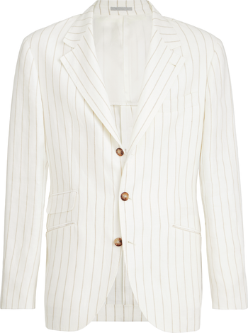 A modern variation of a classic tailored pattern, the chalk stripe pure linen twill enriches the fabric’s natural, compact weave with a light, crisp hand. The natural slubbing, enhanced by the nuanced finish, creates irregular color effects that bring out the season’s colors. The cupro half-lining provides added comfort.