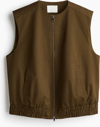 Gilet in twill featuring a round neckline and a two-way zip down the front. Yoke at the back, forward-facing shoulder seams and welt side pockets. Smocked elastication at the hem. Lined.