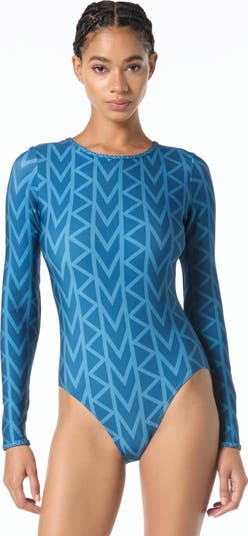 For paddle boarding and sun protection, this long sleeve one piece swimsuit is a cool fit. A logo scuba fabric is bold with a splash of designer logo.