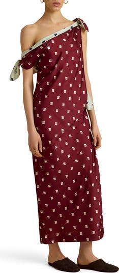 This foulard-inspired tie dress embraces the designer's take on the tabard, showcasing a navy twill base with maroon dots, with a contrast maroon and ivory lining. The asymmetrical neckline and shoulder tie add a unique touch, while the bias-cut construction skims over the body with ease. A versatile statement piece that seamlessly transitions from day to evening.