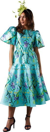Make a statement at your next event with this eye-catching twill midi dress from Coast. The vibrant floral print and puff sleeves create a bold, feminine look that's sure to turn heads. The fitted waist and flared skirt work together to create a flattering silhouette that suits a variety of body types. Ideal for weddings, race days, or formal garden parties, this dress offers versatility and sophistication.