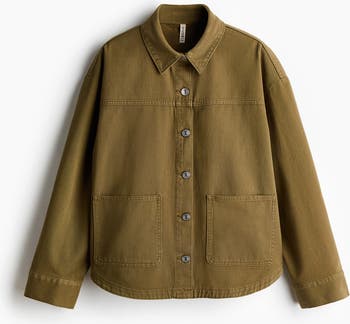 Shacket in cotton twill with a collar and buttons down the front. Yoke at the front and back, patch front pockets and a straight-cut hem with curved side vents. Unlined.