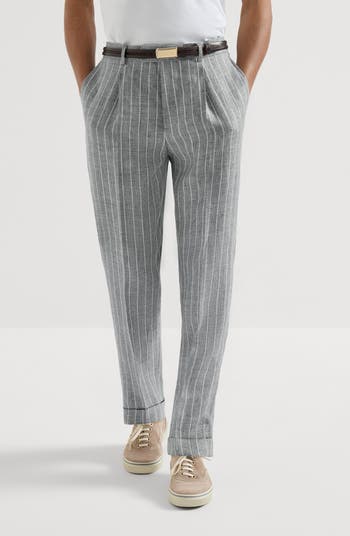 A modern variation of a classic tailored pattern, the chalk stripe pure linen twill enriches the fabric’s natural, compact weave with a light, crisp hand. The natural slubbing, enhanced by the nuanced finish, creates irregular color effects that bring out the season’s colors. The cupro half-lining provides added comfort.