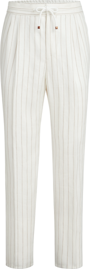 A modern variation of a classic tailored pattern, the chalk stripe pure linen twill enriches the fabric’s natural, compact weave with a light, crisp hand. The natural slubbing, enhanced by the nuanced finish, creates irregular color effects that bring out the season’s colors. The cupro half-lining provides added comfort.