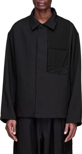Designer Yohji Yamamoto brings utility style to an oversized jacket designed with a distinctive spread collar that converts to a stand collar with a button-tab closure. Made entirely of recycled fibers, it provides innovative style merged with comfort and functionality.