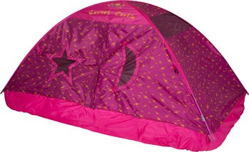 Sweet dreams await your child in this durable bed tent that can accommodate a twin-size mattress. It features doors that can be tied back with radius-cut hook-and loop-fasteners as well as mesh walls that allow for ventilation while keeping bugs at bay. It has double-stitched seams along stress points for reinforcement, and color-coated poles and pole pockets for fast and easy assembly.