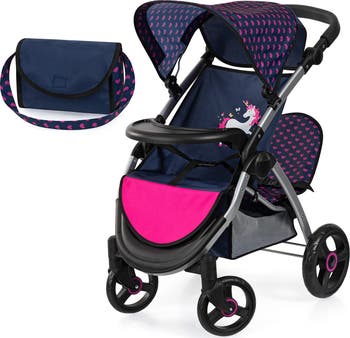 - PUSH YOUR DOLL IN STYLE: The Twin Dolls Stroller is designed for dolls up to 18" (46 cm). Transport your favorite doll, plush, or stuffed animal in style! The stroller has a magical blue, hot pink and unicorn design that your little ones are sure to love!