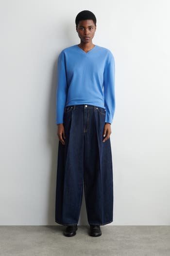 The Twine jeans propose a modern view of denim codes. They're crafted from lightweight cotton and TENCEL™ Lyocell and cut in a directional barrel-leg shape with folded pleats along the front. The dusty-pink hue will complement a classic white shirt.