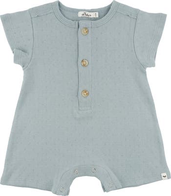 The soft pointelle cotton fabric and raw edge details make it perfect for your little boy. With short sleeves and shorts, this romper will keep your baby comfortable and stylish all summer long. Plus, the button-down front adds a touch of charm. Available in infant sizes. Designed in Minnesota.