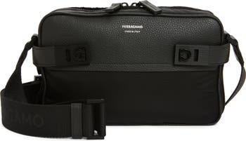 Twin Gancio buckles secure the side tabs of a mixed-media bag fashioned in a boxy silhouette from a balanced blend of pebbled calfskin and nylon.