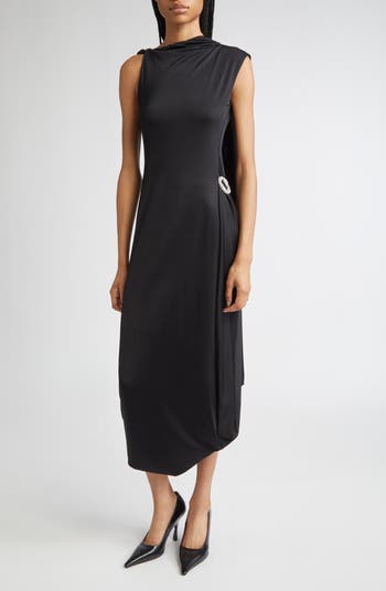 Forever turning twisting into tailoring, Beckham achieves an elegant balance of asymmetry, angularity and languid drape with this event-worthy midi preaccessorized with a sparkling brooch pinned at one hip.
