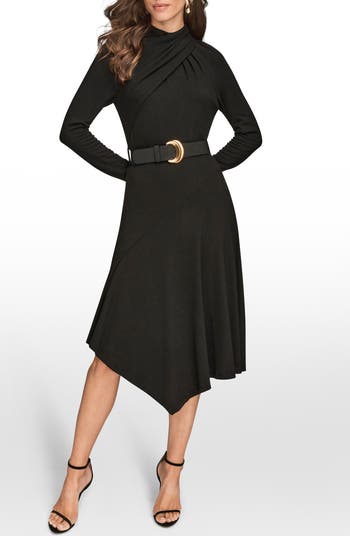 A defining belt shapes the silhouette of this soft stretch-kissed dress made with a twisted front and finished with a drapey asymmetric hem.