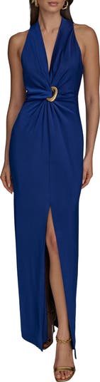 A bold side slit enhances your movement in this show-stealing evening gown gathered with a twist and hardware under the deep V-neck.