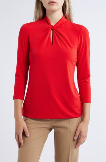 A twisted mock neckline creates a chic keyhole cutout on this versatile jersey top framed by three-quarter sleeves.